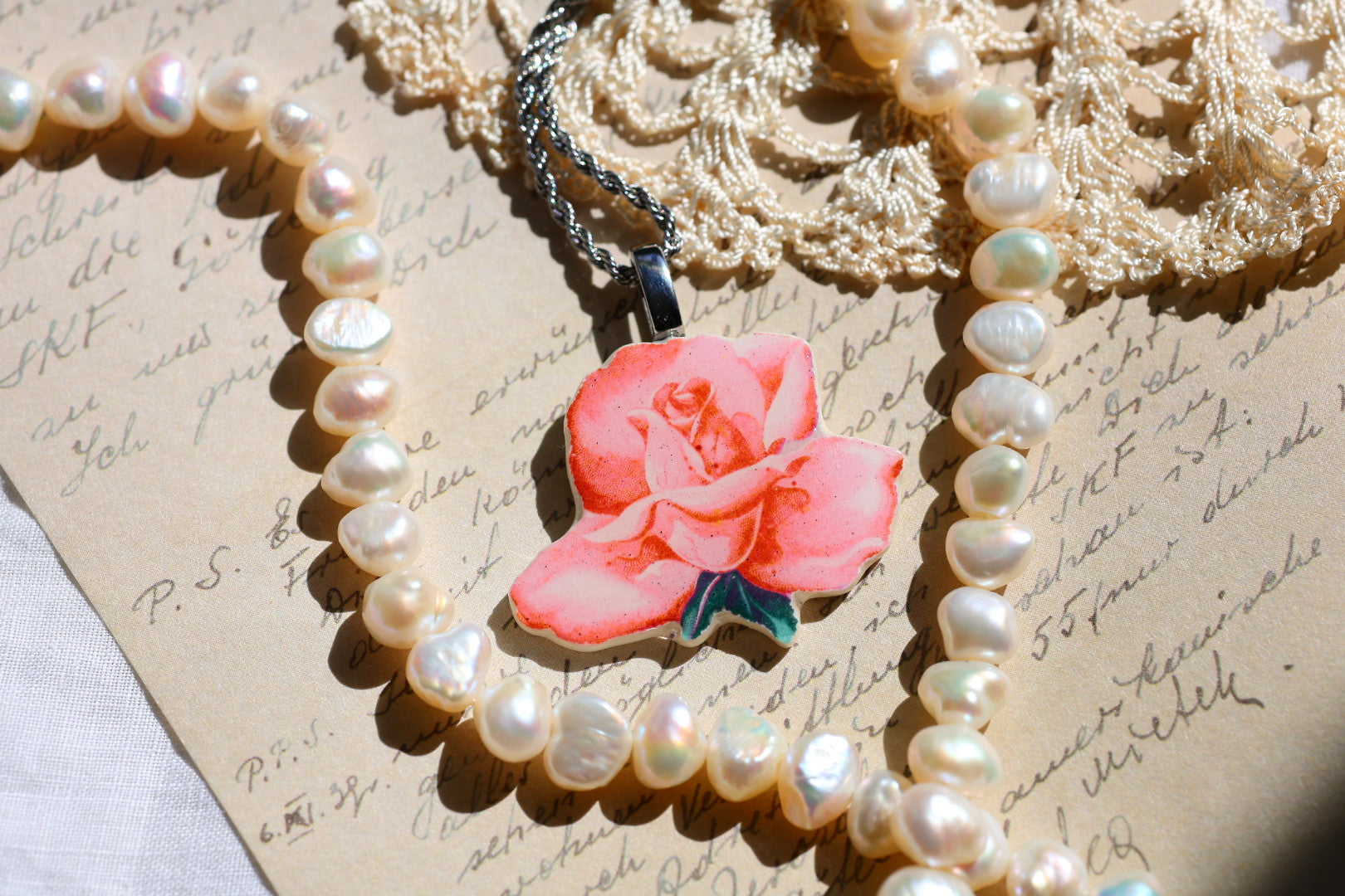 Please remember that these jewelry pieces are made from a unique and unusual medium—vintage dishware. With this, there can be curves and varied thicknesses throughout a single piece.