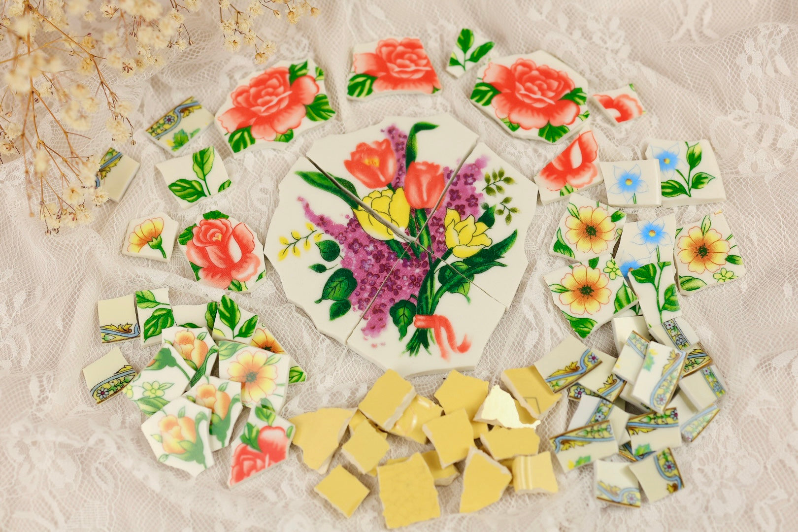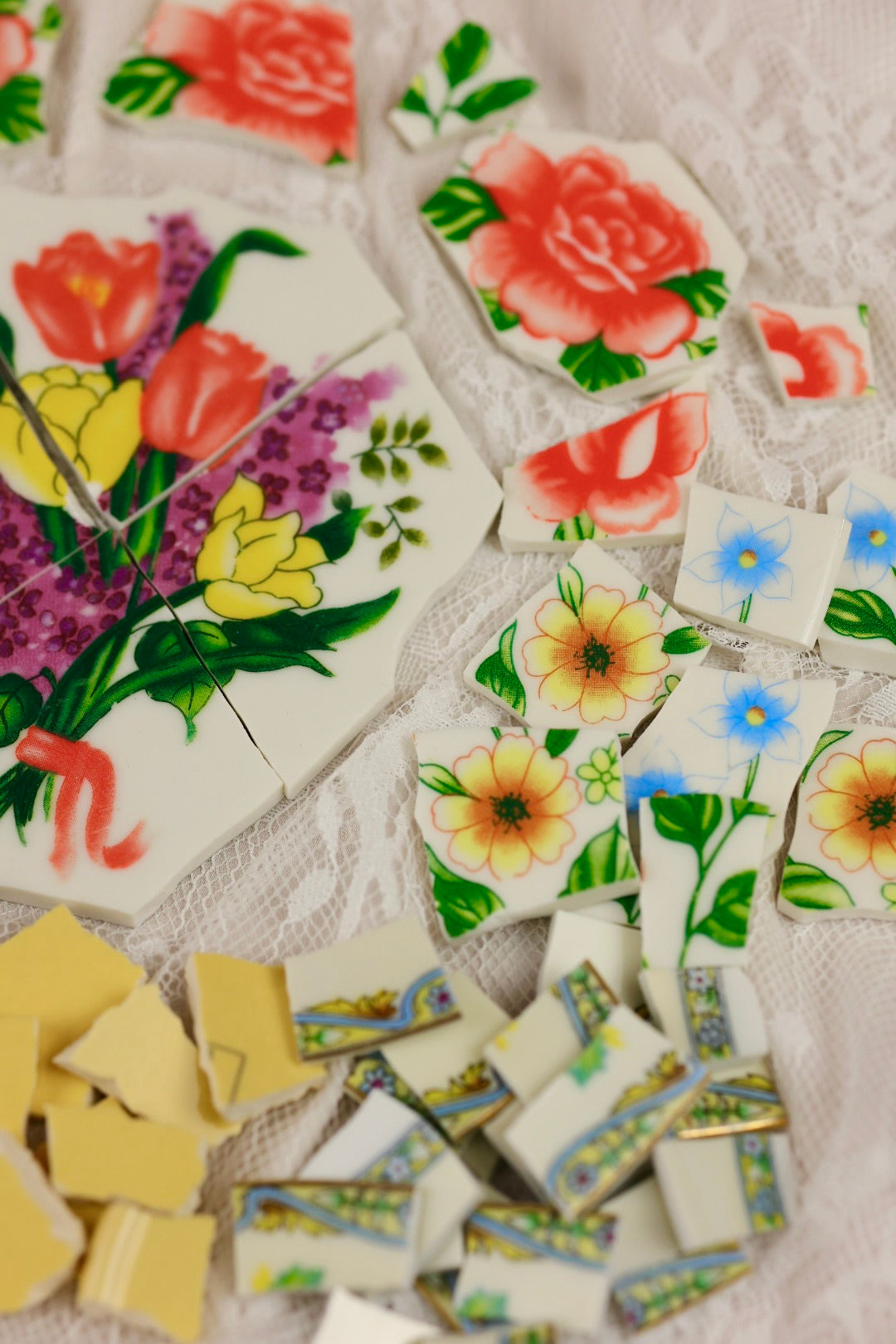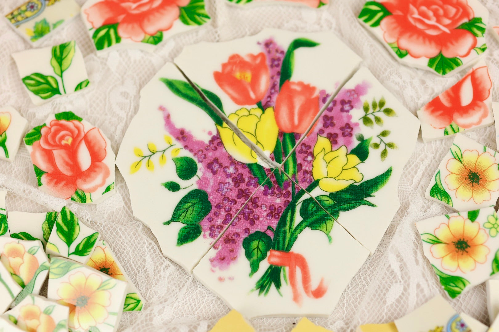 - A hand-selected assortment of broken china Poetic Mosaic tiles