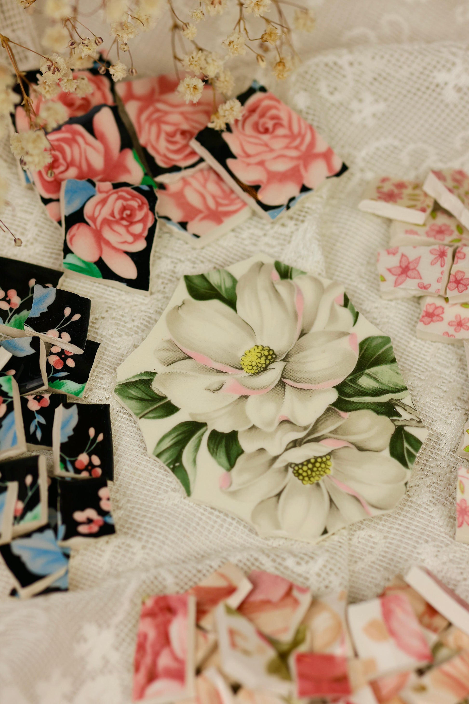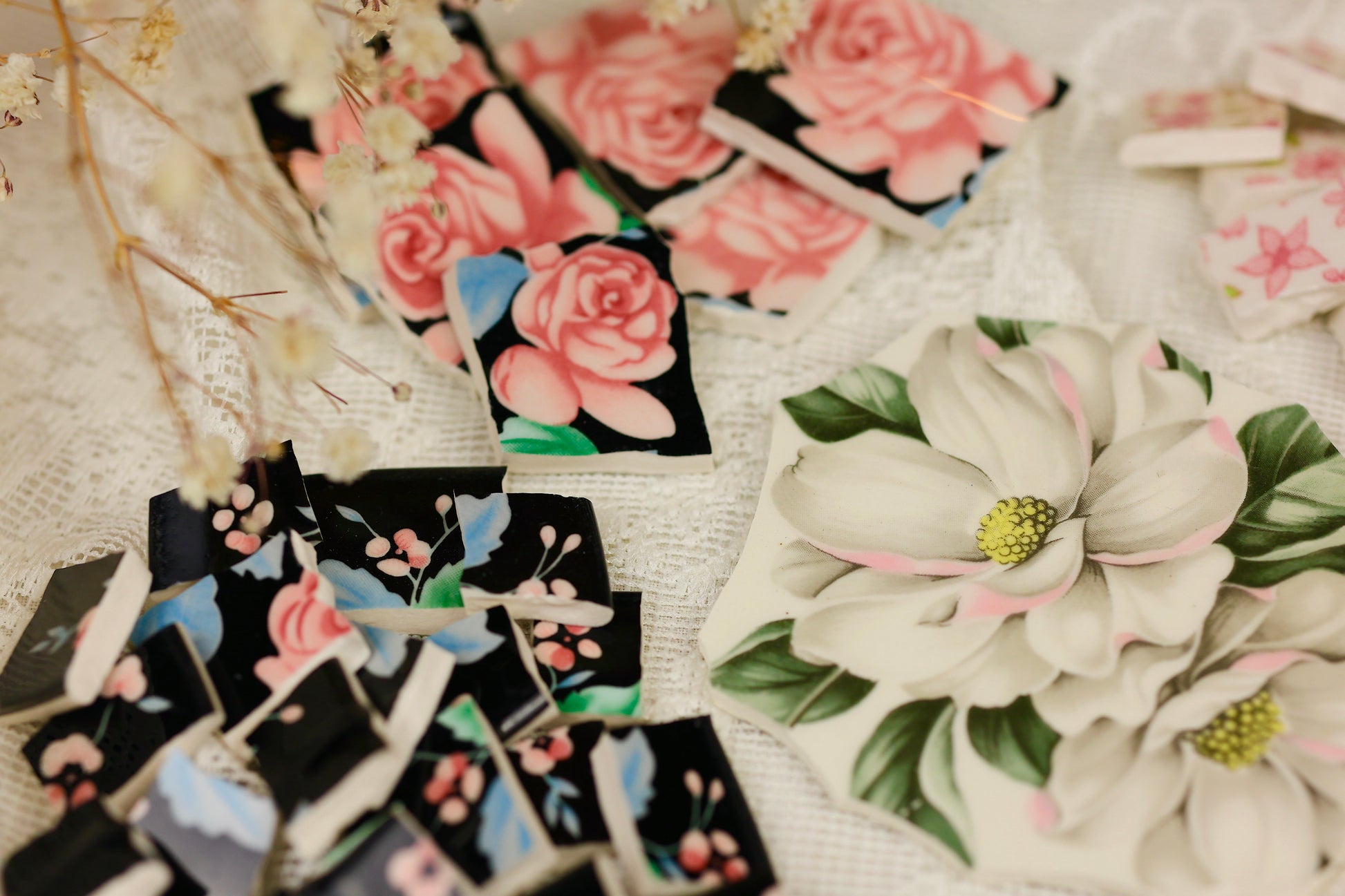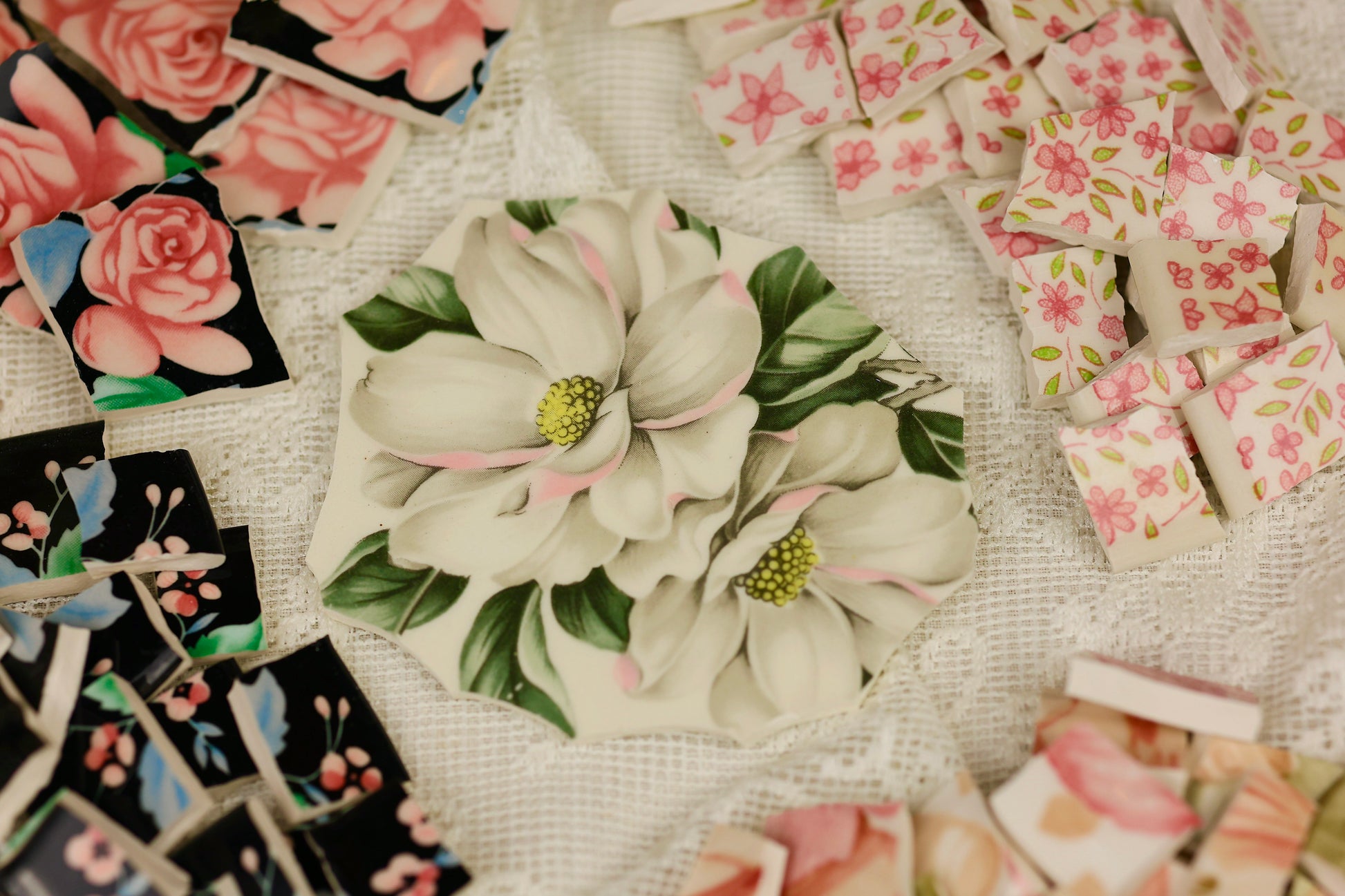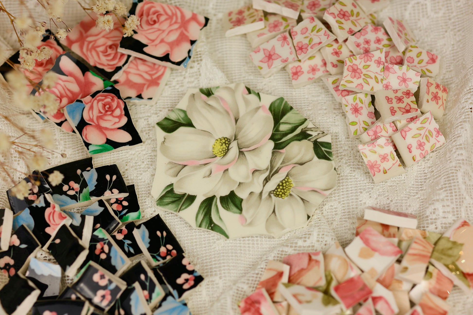 - A hand-selected assortment of broken china Poetic Mosaic tiles