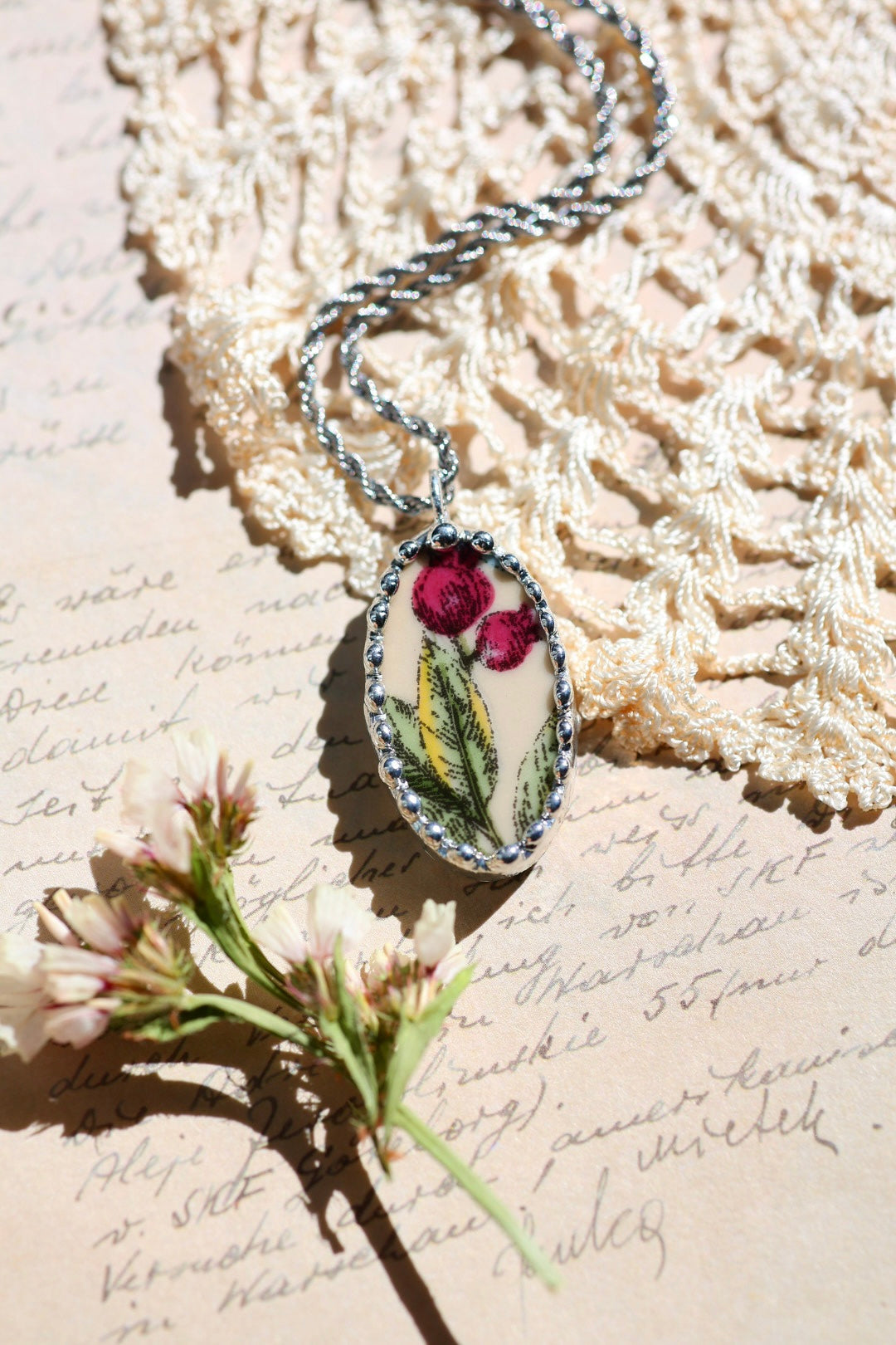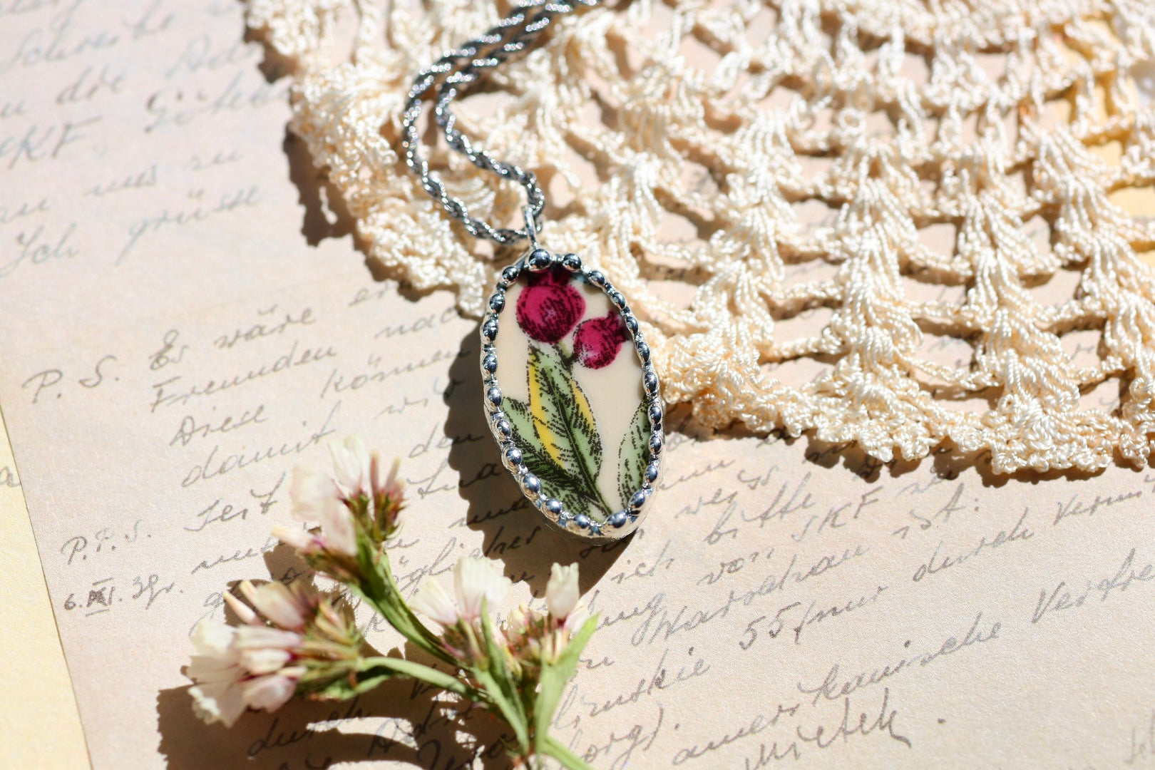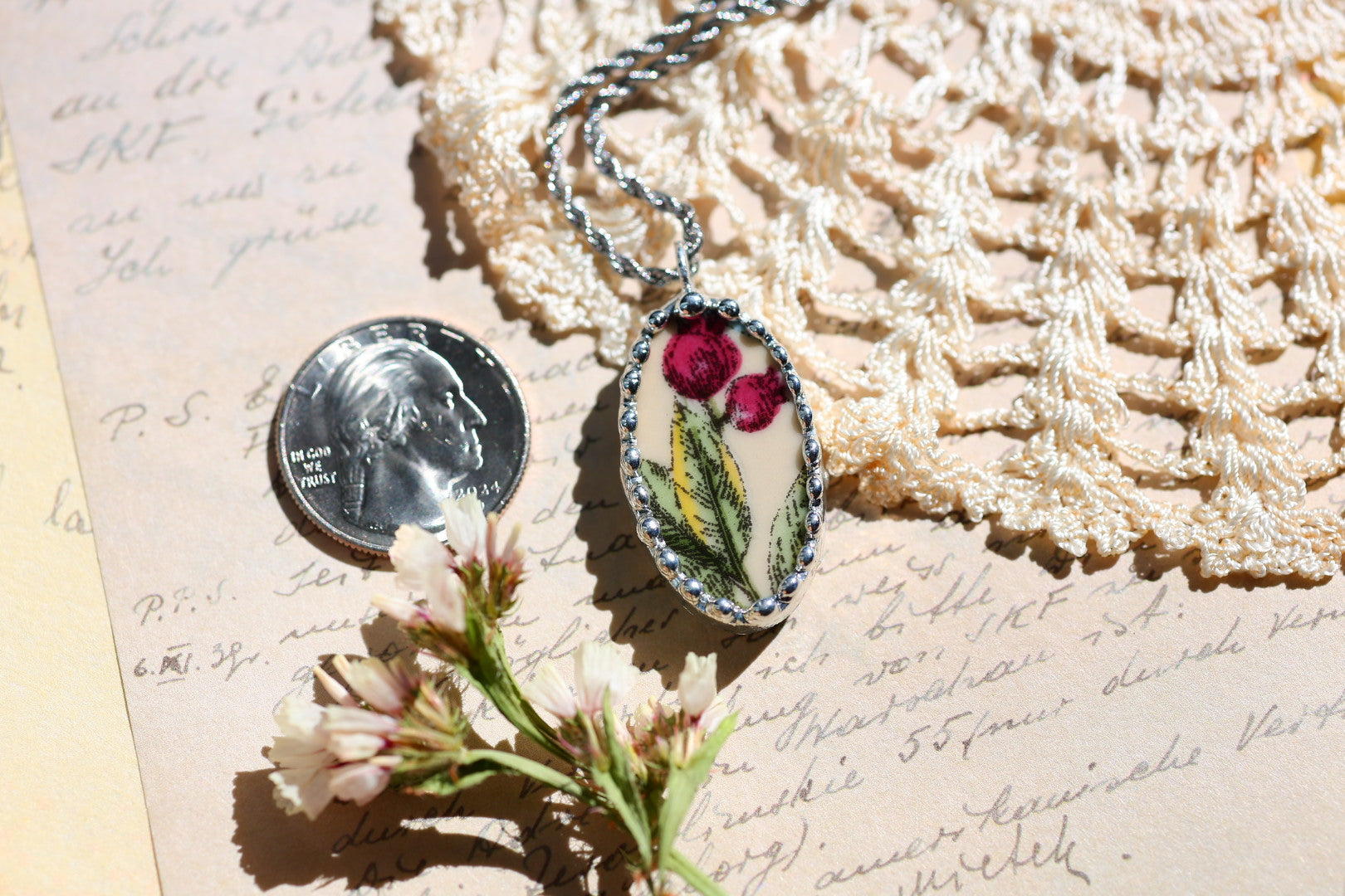 Please remember that these jewelry pieces are made from a unique and unusual medium—vintage dishware. With this, there can be curves and varied thicknesses throughout a single piece.