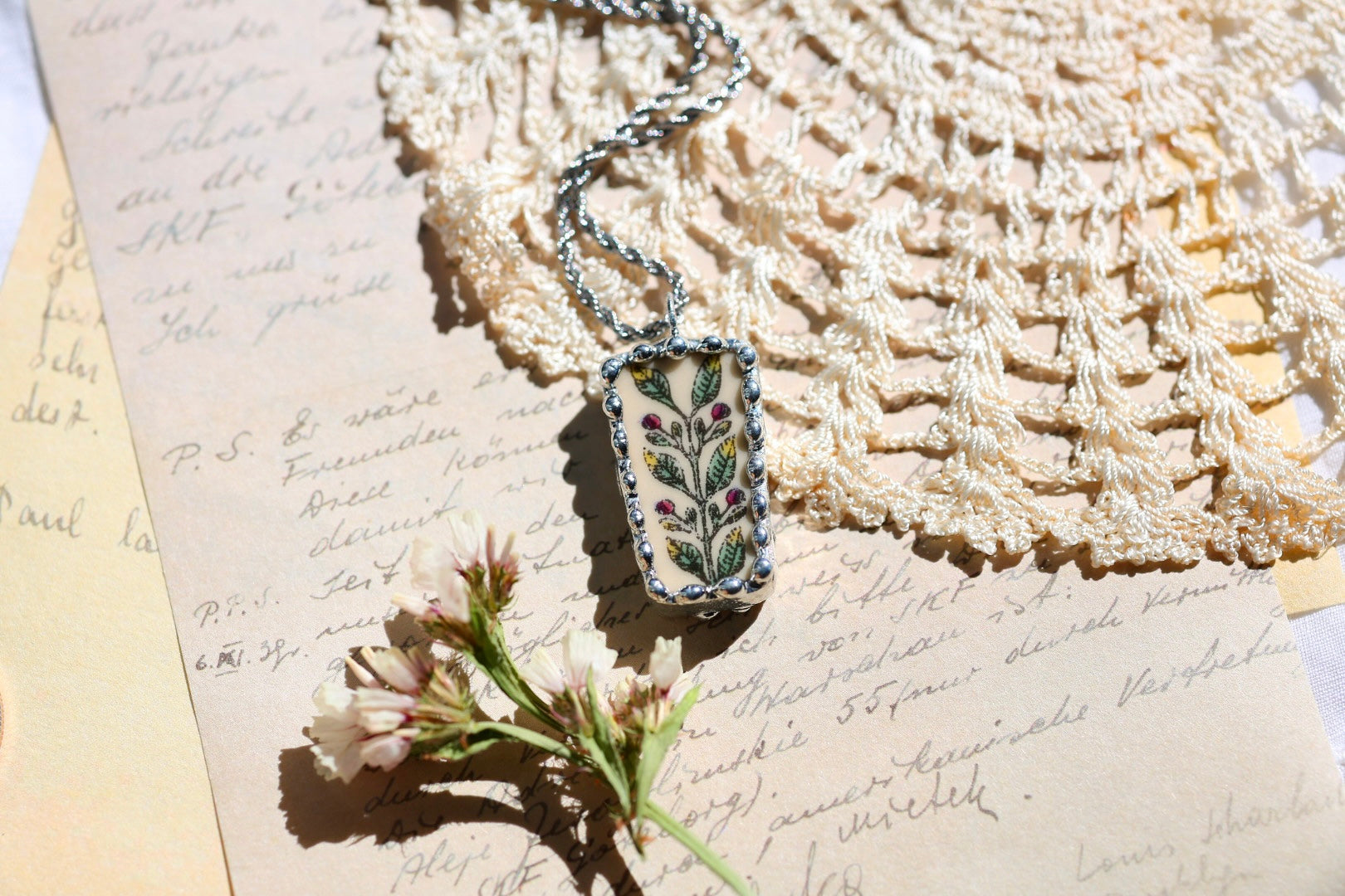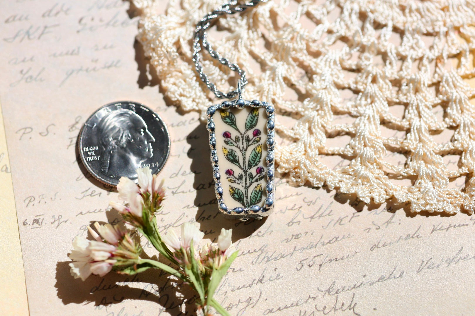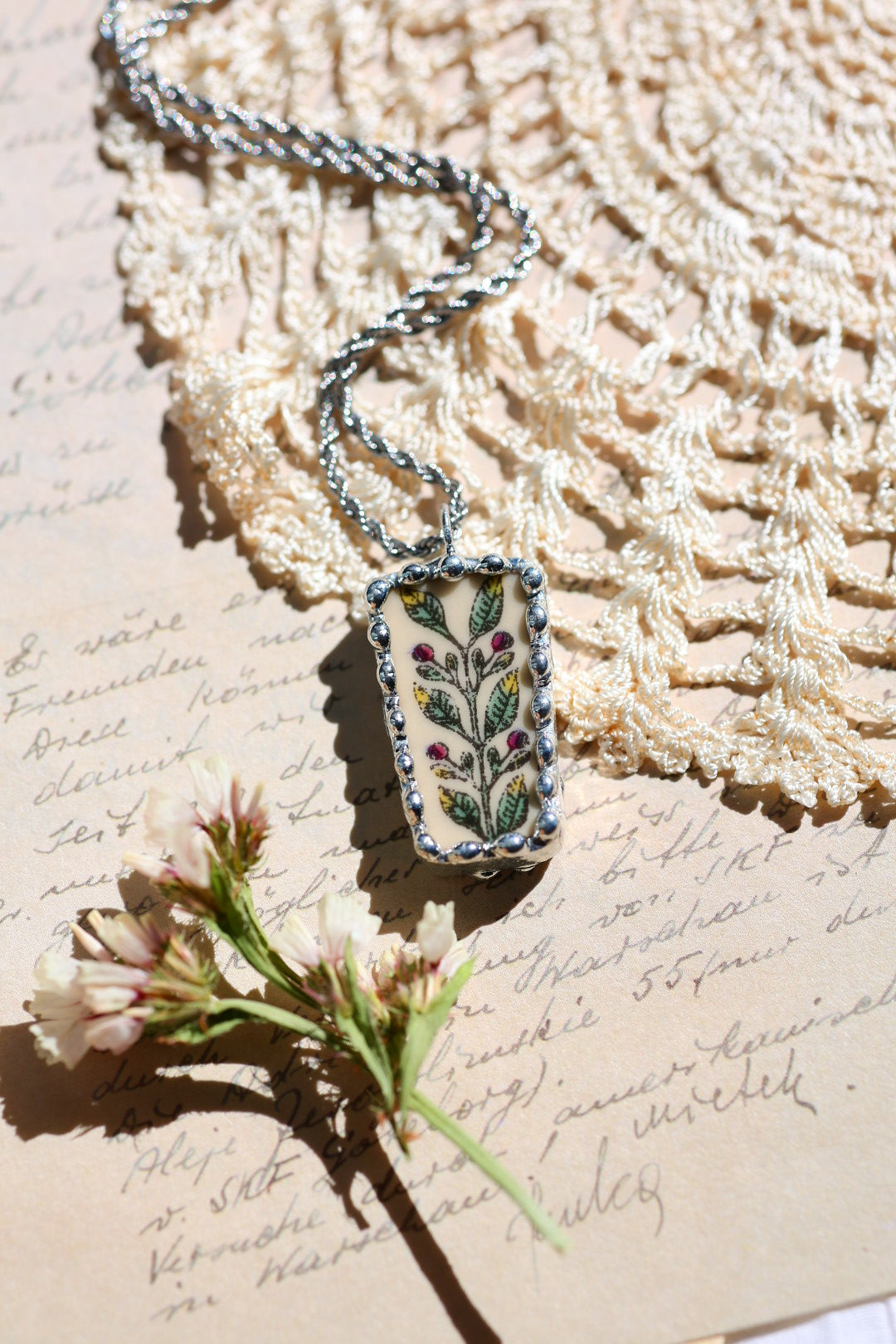Please remember that these jewelry pieces are made from a unique and unusual medium—vintage dishware. With this, there can be curves and varied thicknesses throughout a single piece.